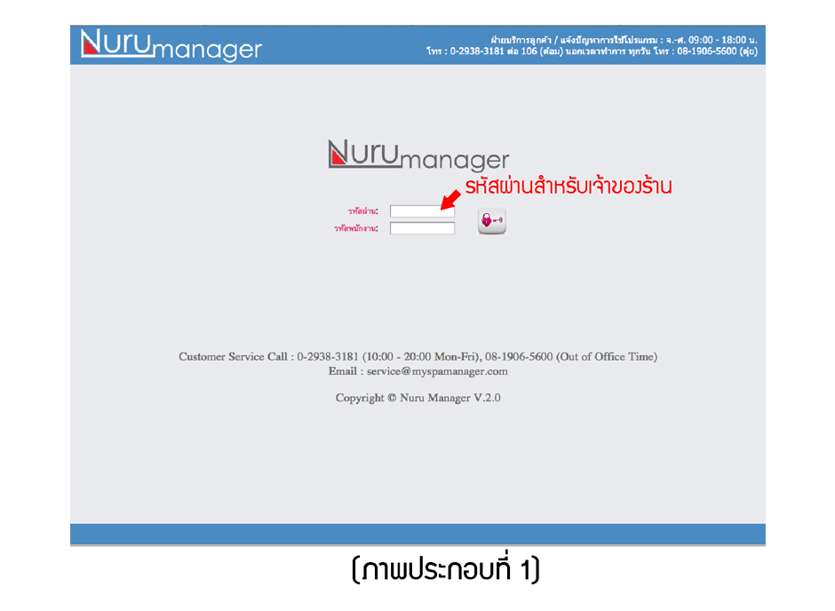 การเข้าสู่ระบบของ Nurumanager ครั้งแรกของการใช้งาน เจ้าของร้านใส่รหัส “admin” ในช่อง “รหัสผ่าน” เพียงอย่างเดียวก็สามารถเข้าใช้งานระบบได้โดยไม่ต้องใส่ “รหัสพนักงาน” (ตามภาพประกอบที่ 1)