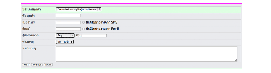 ในส่วนนี้ผู้ที่ใช้โปรแกรมสามารถเพิ่มข้อมูลของลูกค้ารายใหม่ได้ ข้อมูลจะถูกเก็บลงในฐานข้อมูลของโปรแกรม สามารถเรียก