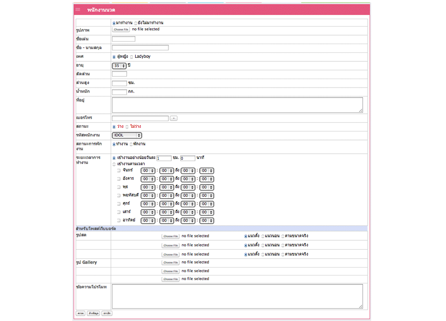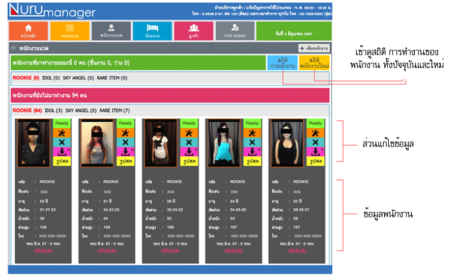 | หน้านี้ผู้ใช้งานสามารถ เพิ่มหรือแก้ไขข้อมูลรายละเอียด เข้าดูสถิติการทำงานของพนักงานนวดแต่ละคนได้ โดยรายละเอียดต่างๆ