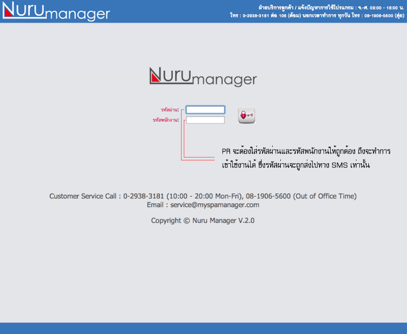 สำหรับหน้าLoginของพนักงาน PRร้านจะต้องใส่รหัสผ่านที่ได้จากระบบที่เปลี่ยนแปลงทุกวันคู่กับรหัสประจำตัวพนักงานให้ถูกต้อง