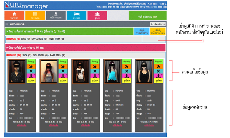 หน้านี้ผู้ใช้งานสามารถ เพิ่มหรือแก้ไขข้อมูลรายละเอียด เข้าดูสถิติการทำงานของพนักงานนวดแต่ละคนได้ โดยรายละเอียดต่างๆ จะปรากฏตามรูปข้างล่างนี้